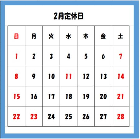 お知らせ 【2月定休日のお知らせ】 2026年1月30日 平素よりお引き立てを賜り厚く御礼申し上げます。 2月の定休日になります。 ご不便おかけし申し訳ございませんが、ご理解の程よろしくお願いいたします。 ※営業時間は、平日8:45~17:45
